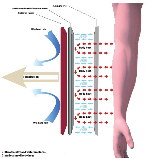An outer fabric (100% micro polyester for the fleece) is laminated to a breathable polyurethane membrane that uses 30% aluminium. A durable water-repellent coating is applied to the surface and the incorporated lining is both antistatic and moisture wicking for enhanced protection and breathability. With no bulky wadding required, the result is a thin, lightweight thermal garment.