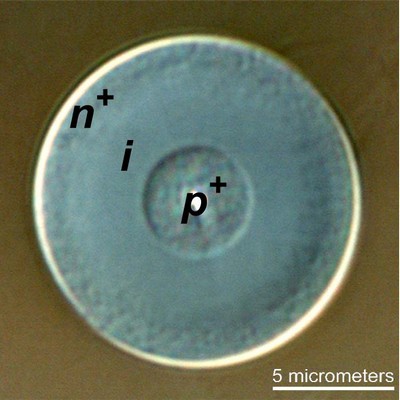 A cross-sectional image of the new silicon-based optical fiber with solar-cell capabilities. Shown are the layers — labeled n+, i, and p+ — that have been deposited inside the pore of the fiber. Credit: Badding lab, Penn State