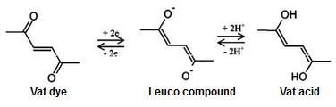 As a vat dye indigo needs to be reduced to its water-soluble form before it can be used in dyeing. The reduced form is called the leuco compound, leuco coming from the Greek word leucos meaning white, which refers to the change of colour of the vatting liquid after reduction. With indigo the colour of the leuco-indigo solution is yellow green when reduced with sodium dithionite. Several different methods have been invented for the indigo reduction and dyeing, all starting from the fermentation vat, which was used for centuries before the modern technology came. The fermentation process was done in large wooden barrels called vats from which the name for the vat dyes also comes. There were also urine vats which used stale urine as an ingredient in the fermentation. The industrial revolution brought new possibilities to the dyeing with such methods as “copperas” method which combined ferrous sulphate with slaked lime or potash and zinc-lime vat in which slaked lime and zinc powder interacted to form hydrogen as a reducing agent. The universal reducing agent sodium dithionite was finally introduced to the vat dyeing at the end of the 19th century.
