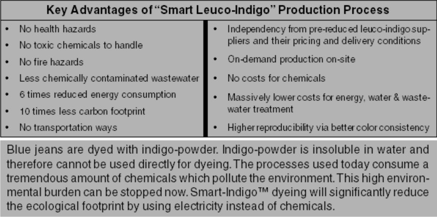 SmartIndigo™ will resolve these issues. This Swiss invention which utilises a 100yearold discovery (A. Brochet, 1917) becomes reality. Tons of leucoindigo can be produced without chemicals.