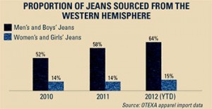 Shifts In Sourcing : Recent changes in sourcing costs have been accompanied by shifts in sourcing locations. These changes widened existing differences in the countries where retailers import jeans for males and females. Jeans for men and boys are largely sourced from Western hemisphere countries. Mexico is the largest single source of jeans for men and boys. Seasonally adjusted data for the first four months of 2012 show that Mexico’s share of the men’s and boys’ jeans market averaged 49%, reaching its highest level since 2005. In contrast, women and girls jean imports primarily come from Asia, with China being the largest single supplier.