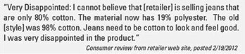 Significantly, the majority of both male and female consumers (53% and 62%, respectively) said they are bothered that retailers may be substituting synthetic fibers for cotton in their jeans. Retailers may not have anticipated that most consumers (63%) would indicate a willingness to pay a slightly higher price to keep higher levels of cotton in their jeans. For consumers ages 25 to 34, the willingness to pay more is even higher, with 69% being inclined to pay more to keep their jeans cotton-rich. Consumer reviews from a clothing retailer’s web site help illuminate some of the concerns about the comfort, feel, look, and quality of current jean offerings.