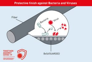 HeiQ Viroblock by CHT is a textile treatment for industrial use, designed to provide textiles with antiviral and antibacterial properties. The combination of silver antimicrobial technology and vesicle technology rapidly destroy enveloped viruses including coronaviruses. It has previously been tested against coronavirus 229E, another strain of virus in the Coronavirus family.