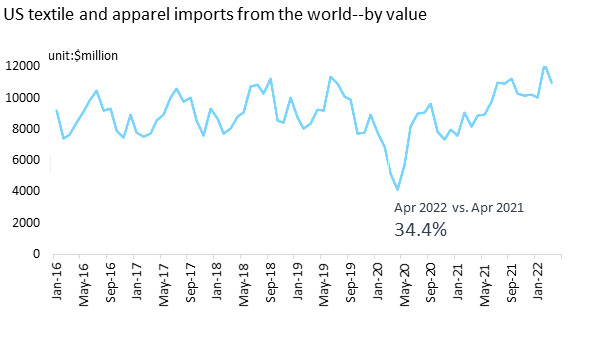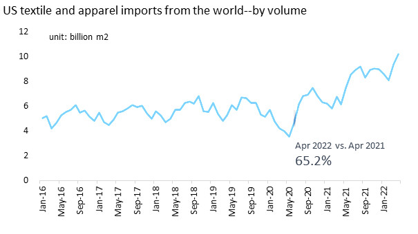 The latest data showed that US textile and apparel imports value in Apr 2022 increased to 10.99 billion USD, up by 34.4% year-on-year. The imports volume reached 10.18 billion m2, up by 65.2% year-on-year. US apparel imports value in Apr 2022 rose sharply to 8.12 billion USD, up by 43.2% year-on-year, and the imports volume reached 2.68 billion m2, up by 29.7% year-on-year.