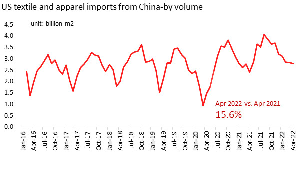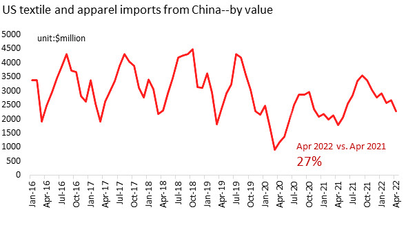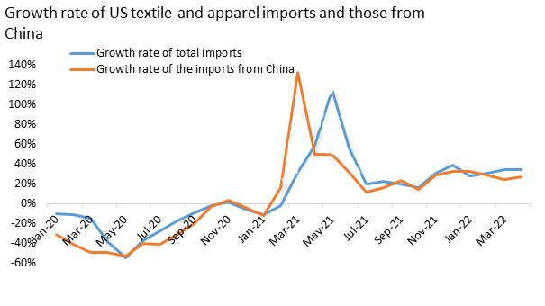 From the monthly data, the US textile and apparel imports from China saw a monthly fall, down 21.2% compared to Mar.