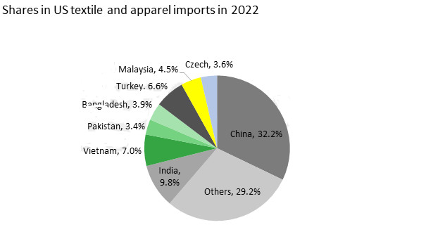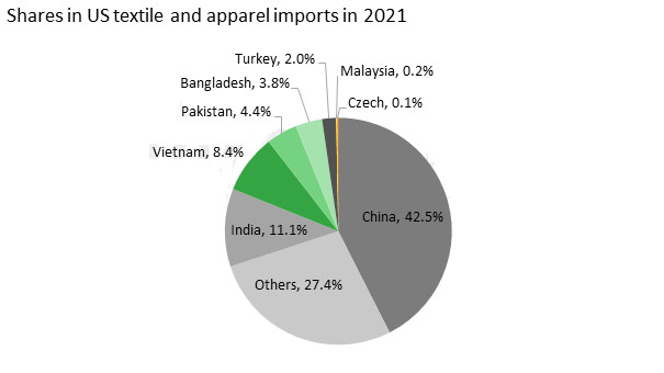 In addition, from the market shares in US textile and apparel imports, China’s share in US textile and apparel imports has shrunk from 42.5% in 2021 to 32.2% in 2022, and the shares of Turkey, Malaysia and Bangladesh all increased.