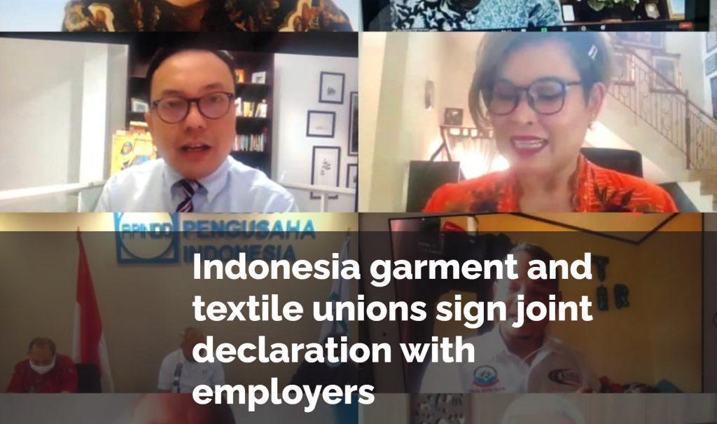 The joint commitment was signed by the Indonesian Employers’ Association (Apindo), the Indonesian Textile Association (API) and the Indonesian Footwear Association (Aprisindo) representing the employers. From the worker’s side, it was signed by the Federations of Textile, Clothing and Leather Unions of the Confederation of All Indonesian Workers Union (FSP-TSK KSPSI) and of Confederation of Indonesian Trade Union (FSP-TSK KSPI) as well as the Federation of Garment, Handicraft, Textile and Industrial Centers of the Indonesian Labour Union Confederation (FSB-Garteks KSBSI) and Confederation of National Workers Union (KSPN).