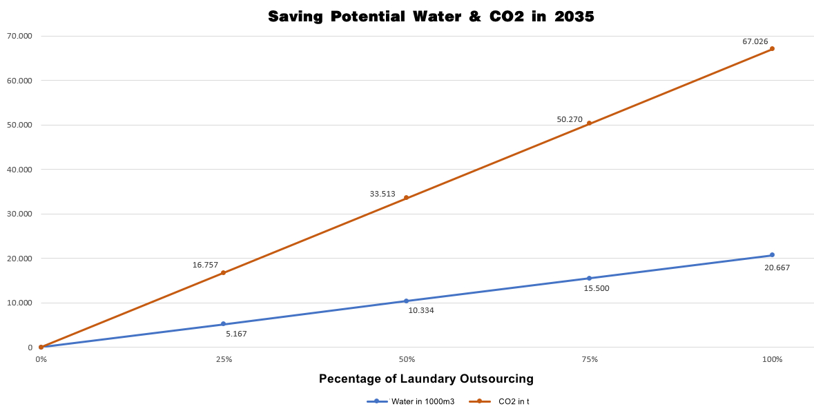 “There is great sustainability potential in using the professional textile service for laundry care in home care,” says Prof. Frank Schmitz. Data collection has shown that the water and energy consumption per kilogram of laundry in industrial laundries is significantly lower than that of household appliances. The study outlines several scenarios for professional textile care in the home care sector. A proportionate centralization of laundry treatment of 25% leads to savings of around 5.17 million m³ of water and 16.76 thousand tons of CO2 in 2035.