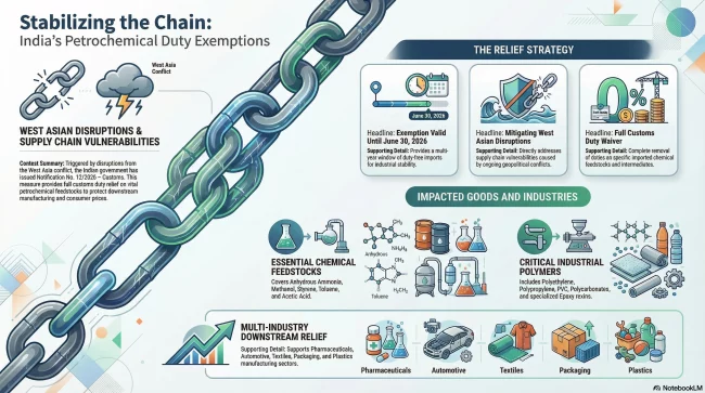To combat supply chain volatility caused by geopolitical conflict, the Indian government has completely eliminated import taxes on numerous vital petrochemicals. This strategic tax relief, which remains active until mid-2026, targets essential materials like polymers, resins, and specialized chemicals used in diverse manufacturing sectors. By lowering the cost of these raw materials, officials aim to support industries ranging from pharmaceuticals to automotive production while shielding consumers from price spikes. The initiative serves as a protective measure to ensure domestic economic stability and industrial competitiveness during global uncertainty. Ultimately, the policy reflects a proactive effort to maintain the consistent availability of finished goods across the nation.