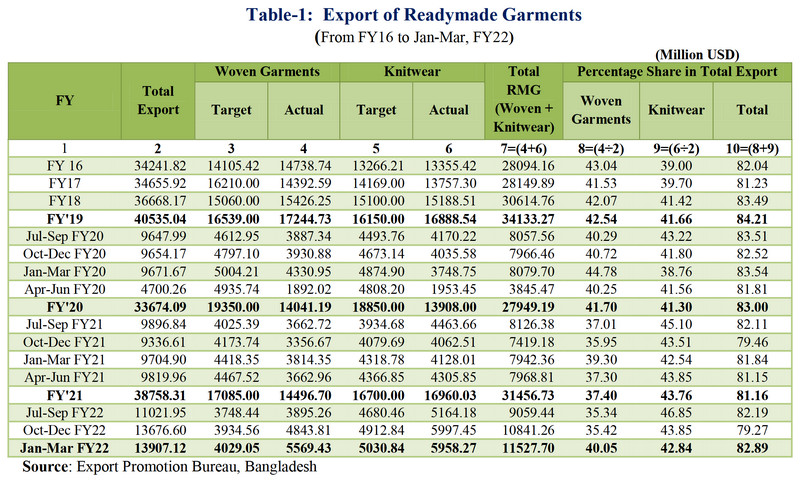 RMG’s export earnings stood at USD 11527.70 million during the third quarter of FY22. Due to an improvement in the COVID-19 situation, RMG’s export earnings were 27.24 percent higher than that of the quarterly target. Woven garments and knitwear contributed 40.05 percent and 42.84 percent to total export earnings during the period under review respectively (Table-1).