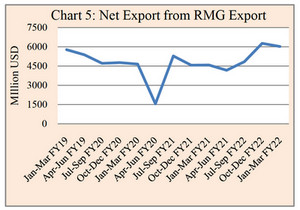 From these countries, Bangladesh earned USD 8421.52 million as RMG export earnings, accounting for 90.68 percent of total RMG exports. - In this quarter, RMGs net export (determined by subtracting RMG raw material import value from RMG export value) was USD 6022.53 million, or 52.24 percent of gross RMG export.