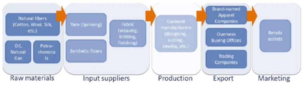 Companies in Jordan focus on the garment production node of the value chain. Inputs have to be sourced from abroad — no fabrics are produced in Jordan for lack of domestic cotton production and water shortage.