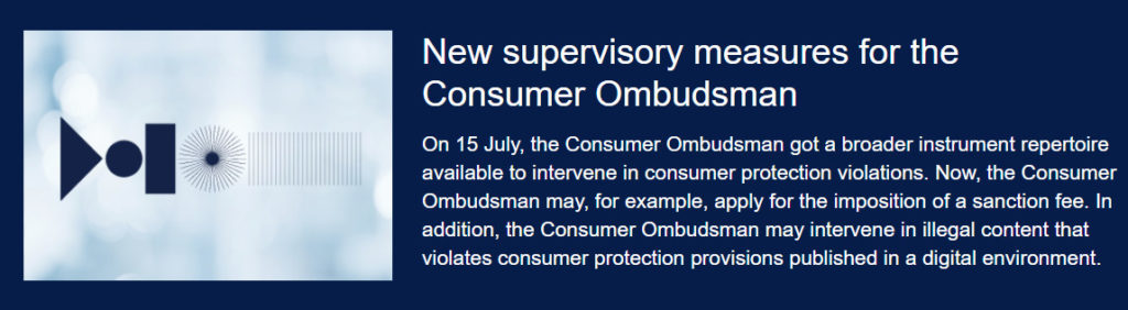 Starting from July 15, the Finnish Consumer Ombudsman got a broader instrument repertoire available to intervene in consumer protection violations. Now, the Consumer Ombudsman may, for example, apply for the imposition of a sanction fee. In addition, the Consumer Ombudsman may intervene in illegal content that violates consumer protection provisions published in a digital environment, for example by ordering them to be removed from a website or social media platform. Access to a specific website may also be prevented or restricted.