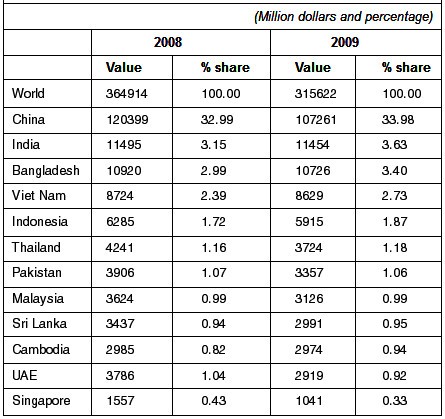 The details of clothing and textile exports value alongwith markets share of leading Asian textile producing countries as well as of India during 2008 and 2009 are given in Table 1 and 2 respectively.