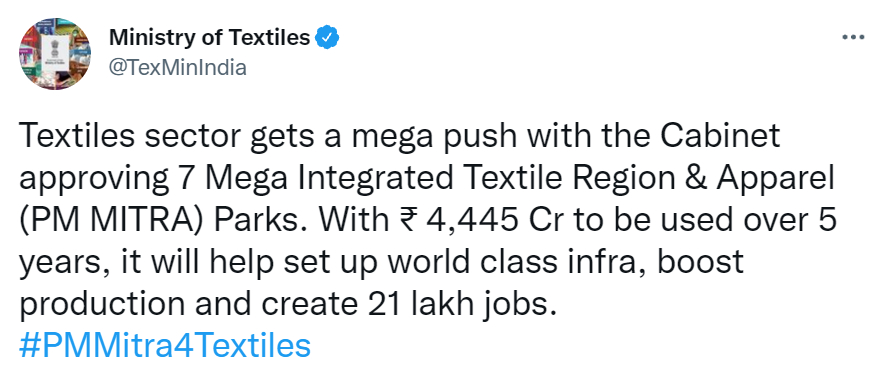 The Cabinet Committee has now approved seven PM-MITRA Mega Textile Parks with a total outlay of Rs.4445 crores for a period of five years. The scheme is inspired by the 5F vision of the Hon’ble Prime Minister viz., Farm to Fibre to Factory to Fashion to Foreign. The scheme provides an opportunity to create an integrated textile value chain in a single location with large scale investments. The minimum land area specified for the park is 1000 acres for the development of world-class industrial estate with plug and play facilities.