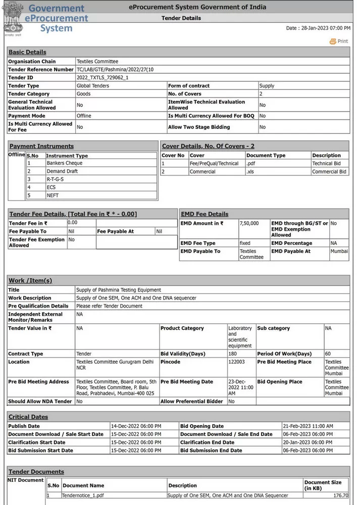 Textiles Committee, Mumbai, has issued a global tender (Reference Number TC/LAB/GTE/Pashmina/2022/27(10; Tender ID 2022_TXTLS_729062_1) for the procurement of 03 instruments for Pashmina Testing for Laboratory at Textiles Committee Gurugram Delhi NCR-122003.