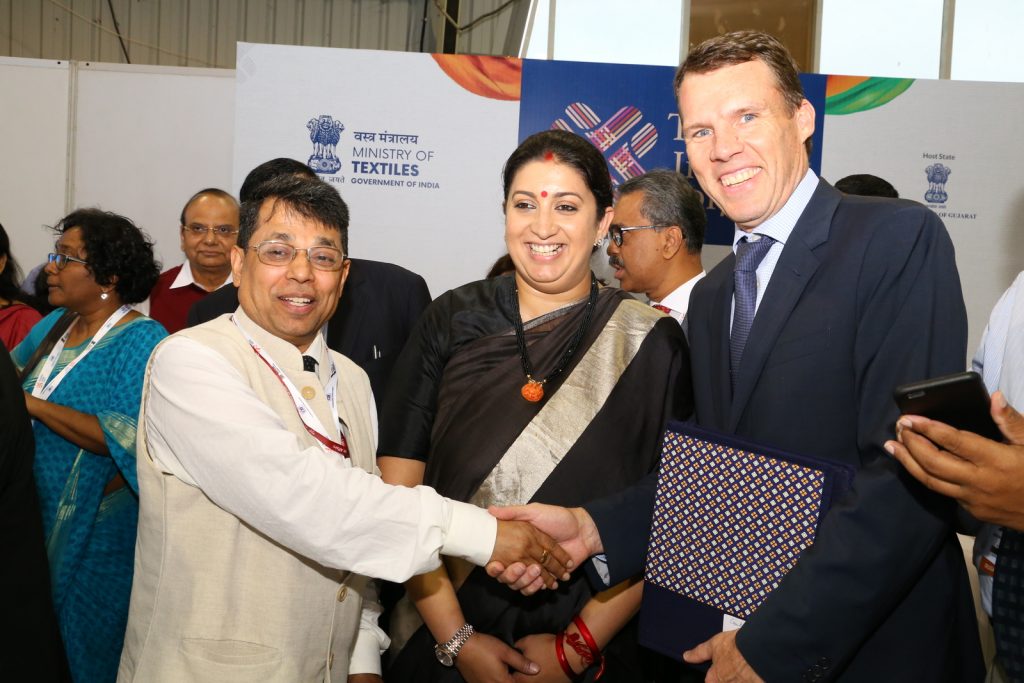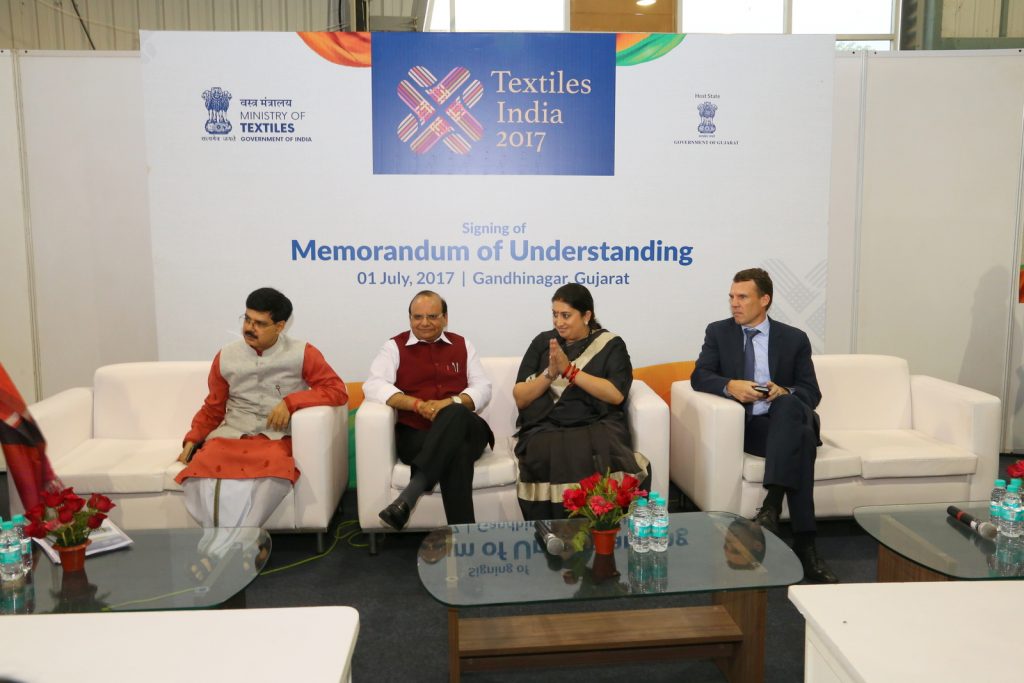 Union Textiles Minister Smt. Smriti Zubin Irani and Minister of State, Textiles, Shri Ajay Tamta witnessed the signing of 65 MoUs in the textiles sector on the 2nd day of the three-day mega textiles trade fair, Textiles India 2017, being held in Gandhinagar, Gujarat. MoUs were signed on July 1, 2017 between various domestic and international organizations from industry and government; three of the MoUs signed are G2G MoUs. The MoUs signed relate to exchange of information and documentation, Research & Development, commercialization of handloom products and silk production, cooperation in Geo textiles, skill development, supply of cotton and trade promotion with overseas partners, etc.
