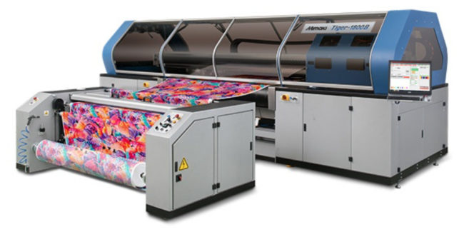 | Tiger-1800B | Maximum print speed: 385 m2/h (*) 16 printheads arranged in two staggered lines. Tiger-1800B fits high-volume productions that were printed by analog printing methods.* High speed (3 droplet size) mode (600 × 600 dpi, 1 pass, Bi) Textile width:1,850 mm |