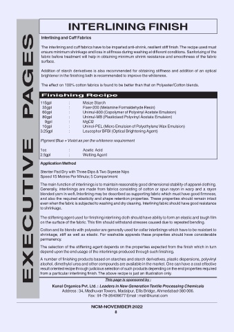 The interlining and cuff fabrics have to be imparted anti-shrink, resilient stiff finish. The recipe used must
